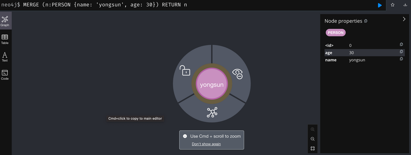MERGE (n:PERSON {name: 'yongsun', age: 30})
